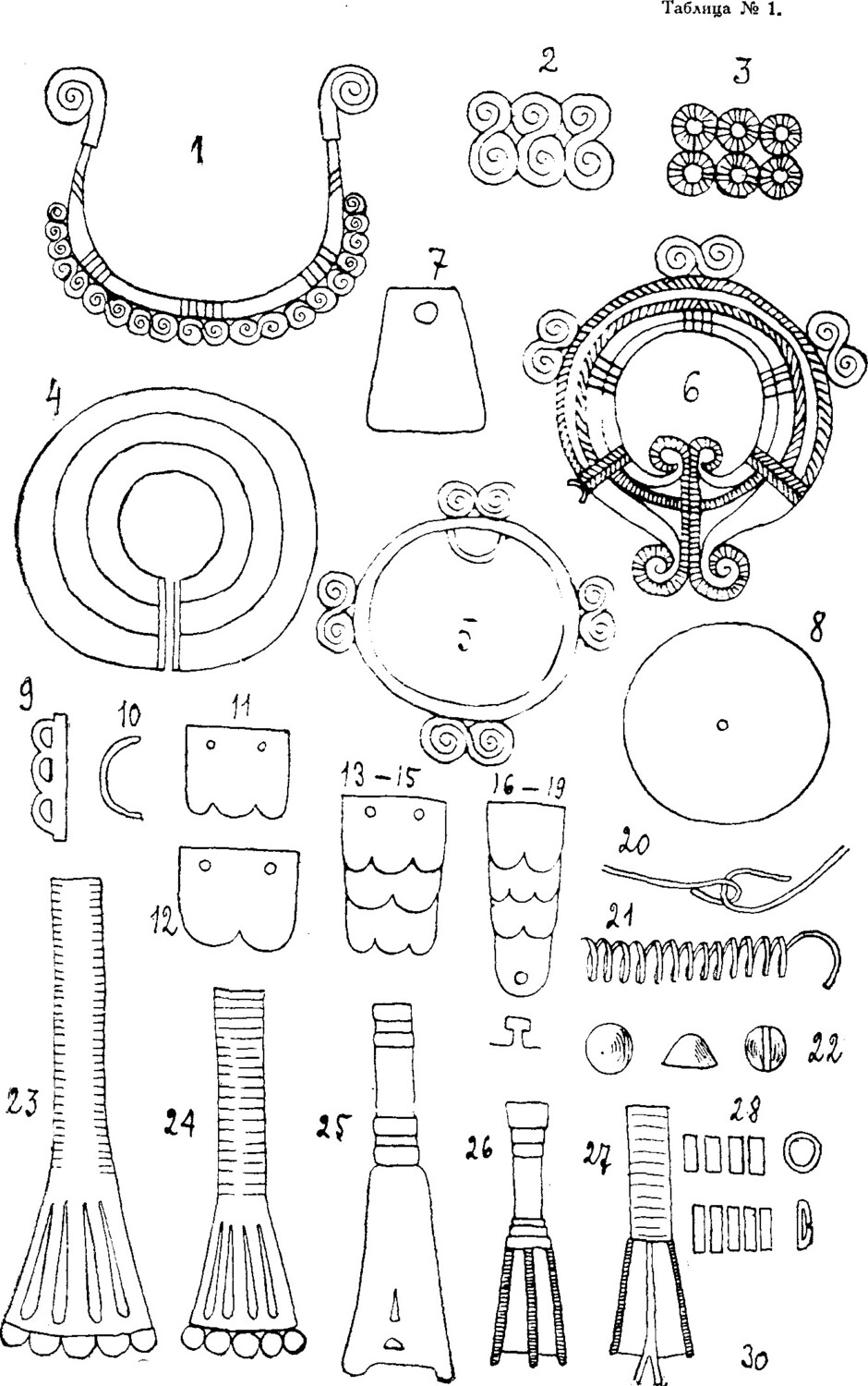 «Весной 1919 года, во время наступления Колчака на Вятку и Казань, были предприняты большие работы по сооружению оборонительной линии вдоль нижнего течения реки Вятки, и по правому (горному) берегу этой реки вырыты были окопы на протяжении 300 верст, в пределах Уржумского, Малмыжского и Мамадышского уездов. При земляных работах крестьяне неоднократно находили древние предметы и погребения. Так, около деревни Сунцово (Шишкино), Рожкинской волости Малмыжского уезда, было найдено древнее погребение, впоследствии послужившее к открытию на этом месте Сунцовского могильника. Верстах в 15 вверх по реке Вятке от этого могильника, у деревни Воробьи, были также найдены древние погребения. Крестьянам попалось здесь много бронзовых предметов, но они часть вещей побросали в реку, а часть растеряли. К счастью, в этом самом районе энергичным деревенским учителем А.И. Янкиным в 1921 году был основан Тушкинский музей, который с течением времени превратился в одну из наиболее замечательных и стойких краеведческих организаций в деревне. А.И. Янкин, всецело преданный краеведческому делу, неутомимо разыскивал и собирал древности среди окрестного населения, и, благодаря ему, в Тушкинский музей были доставлены находки сначала из Сунцовского (1921 г.), а затем и из Воробьевского (1925 г.) могильников. Коллекция древностей, найденных в Воробьях в 1919 году и хранящихся в Тушкинском музее, содержит в себе следующие предметы: 1) большая, эполетообразная застежка Пьяноборского типа, длиною 30 сантиметров, с 19 полушариками вокруг диска и с 11 соединительными шнурами; 2) бронзовое ожерелье в виде цаты, превосходной литой работы, со спиральным орнаментом, размер 12X12 сантиметров (табл. I, рис. 1); 3) кусок гривны из круглой бронзовой проволоки; один конец заострен; длина обломка 13 сантиметров; 4) бронзовые бляшки из трех парных спиралей, размером 3,5X2,3 сантиметра, 2 экземпляра (таб. I, рис. 2); 5) бронзовая бляшка, из трех парных кружков, размером 2,5X1,7 сайт. (таб. I, рис. 3); 6) круглая бронзовая застежка, диаметром 9 см. (таб. I, рис. 4); 7) бронзовая застежка, украшенная спиралями, 5,5X5,5 см. (таб. I, рис. 5); 8) бронзовая застежка. со спиральным и шнуровым орнаментом, 7,5Х6 см. (таб. I, рис. 6); 9) бронзовая подвеска в форме трапеции, 2,8X2,3 см. (таб. I, рис. 7); 10) плоские круглые бляхи из светлой бронзы, с маленьким отверстием в центре, размеры от 3,7 до 5,3 см., 8 экземпляров (таб. I, рис. 8); 11) бляшка прямая, ,с тремя петельками, длина 2,4 см. (таб. I, рис. 9); 12) полуколечко из тонкой бронзовой проволоки (от серьги?), размер по хорде 2 см. (таб. I, рис. 10); 13) чешуйки из светлой бронзы от панциря, с 3 и с 2 зубчиками, наибольший размер 3,3X2,8 см., 9 экземпляров (таб. I, рис. 11—19); 14) бронзовая круглая проволока, длиною 47,5 см., состоящая из двух кусков, соединенных концами в виде крючка и петли (таб. I, рис. 20); 15) соединительные шнуры от сломанной эполетообразной застежки Пьяноборского типа, шириною 0,8 см., длиною от 4,5 до 7 см., 5 экземпляров; 16) фрагменты плоской бронзовой бляхи круглой, с гладкой поверхностью, большого диаметра, 2 экземпляра, 17) бронзовая спираль из плоской проволоки, закрученная в 84 оборота, с крючком на конце (таб. I, рис. 21); 18) кусочек бронзовой проволоки, длиною 3,5 см., 19) круглые бронзовые бляшки двух разновидностей: диаметром 1,3 см.—6 экземпляров и диаметром 1 см.—12 экземпляров (таб. I, рис. 22); 20) бронзовые подвески, напоминающие гусиные лапки, пяти 
