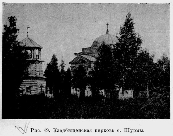 Совершенно перестроена в недавнее время. Приделы во имя св. Николая Чудотворца и пр. Илии. (Вятские Еп. Вед. 1873 г., № 17). На кладбище любопытная деревянная церковь (рис. 49).