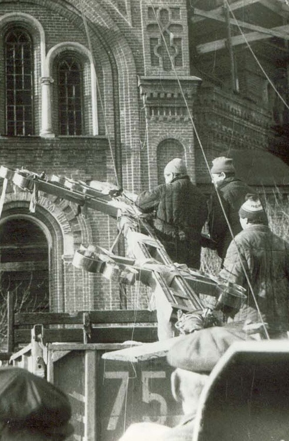 Вначале на сооружении лесов и реставрации кладки, восстановлении одного из боковых куполов были заняты рабочие реставрационного участка, руководимого В.И. Зориным. Впоследствии в работу включились строители из Кирова, которые ведут работы внутри собора.