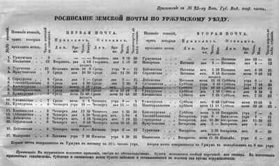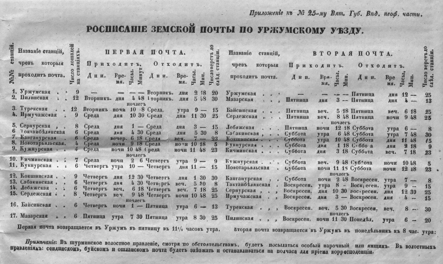 § 1. Для правильных и своевременных сношений губернских и уездных мест с должностными лицами, пребывающими в уезде, и с волостными правлениями, в видах как уменьшения разгона обывательских подвод на посылку нарочных, равно и для доставления частным лицам более удобных сношений как между собою, так и разными присутственными местами и должностными лицами, находящимися в уезде и вне его, учреждается уржумская земская почта. § 2. Отправление почты производится на лошадях, содержимых на станционных пунктах на земский счёт, во время и в местах, назначенных по-особому, при сем приложенному, расписанию. *) § 3. Почта отправляется из г. Уржума с особым рассыльным в дни, назначенные по расписанию, заделанною в кожаную суму, хотя бы при этом не было никаких посылок. Почта обходит весь уезд, два раза в неделю, с двух противоположных сторон. Приём и выдача корреспонденции производится по всему следованию почты. Примечание: Скорость движения почты полагается до 10-ти вёрст в час. § 4. Приём корреспонденции, как казенной, так и частной назначается в г. Уржуме, в уездной земской управе; в селах — в волостных правлениях и в квартирах становых приставов. § 5. Для записывания приёма корреспонденции как казенной, так и частной во все места, означенные в § 4, высылаются от земской управы особые книги, по форме составленной в управе. § 6. За пересылку писем частных лиц, следующих в уезд, полагается три копейки в пользу рассыльных, посылаемых с почтою. Письма, следующие за пределы в уезды, должны быть с наклеенными на них почтовыми марками и определённого почтовыми веса. § 7. По окончании приёма в означенных в § 4-м местах, все пакеты, как свои, так и полученные от других мест и лиц, записываются в разносную книгу, запечатываются или заклеиваются в отдельные конверты для каждого места, с приложением таблиц как частных, так и казенных конвертов, с подробными адресами. Все такие конверты складываются в общую кожаную суму, которую заделывают шнуровкою и прикладывают к колодке сургучную ила восковую печать и, затем, сума сдается следующему с почтой рассыльному, или ямщику; причем выдается ему подорожная с отметкой о времени отправления почты. § 8. Простая частная и казенная корреспонденция, следующая от мест и в места, лежащие по тракту, но неимеющие волостного правления, вкладывается в общую кожаную суму до ближайшего к ним волостного правления, и сим последним вынимается из общей сумы и сдается на руки рассыльным, которыми корреспонденция и передается по адресу, куда следует. § 9. Рассыльный, следующий с почтою, отправляется в указанное по расписанию время, на одноконной или двуконной подводе, смотря по состоянию пути, тяжести почты и времени года, — до ближайшего пункта. Примечание: Рассыльный должен быть не моложе 20 и не старее 60 лет. § 10. Ко времени прихода и отхода почты на станции должна быть готова подвода. В случае неисправности со стороны ямщиков, волостное правление, или, где оного нет, староста, или, за отсутствием, или неисправностью последнего, сотник или десятник должны нанять на счёт ямщика подводу, и рассыльный докладывает об этом обстоятельстве, по возвращении в город, земской управе, для взыскания с виновного. § 11. Лица, отправляющие почту, обязаны каждый раз отмечать в книге на записку расхода подвод о времени прихода и отхода почты. § 12. Волостные правлени