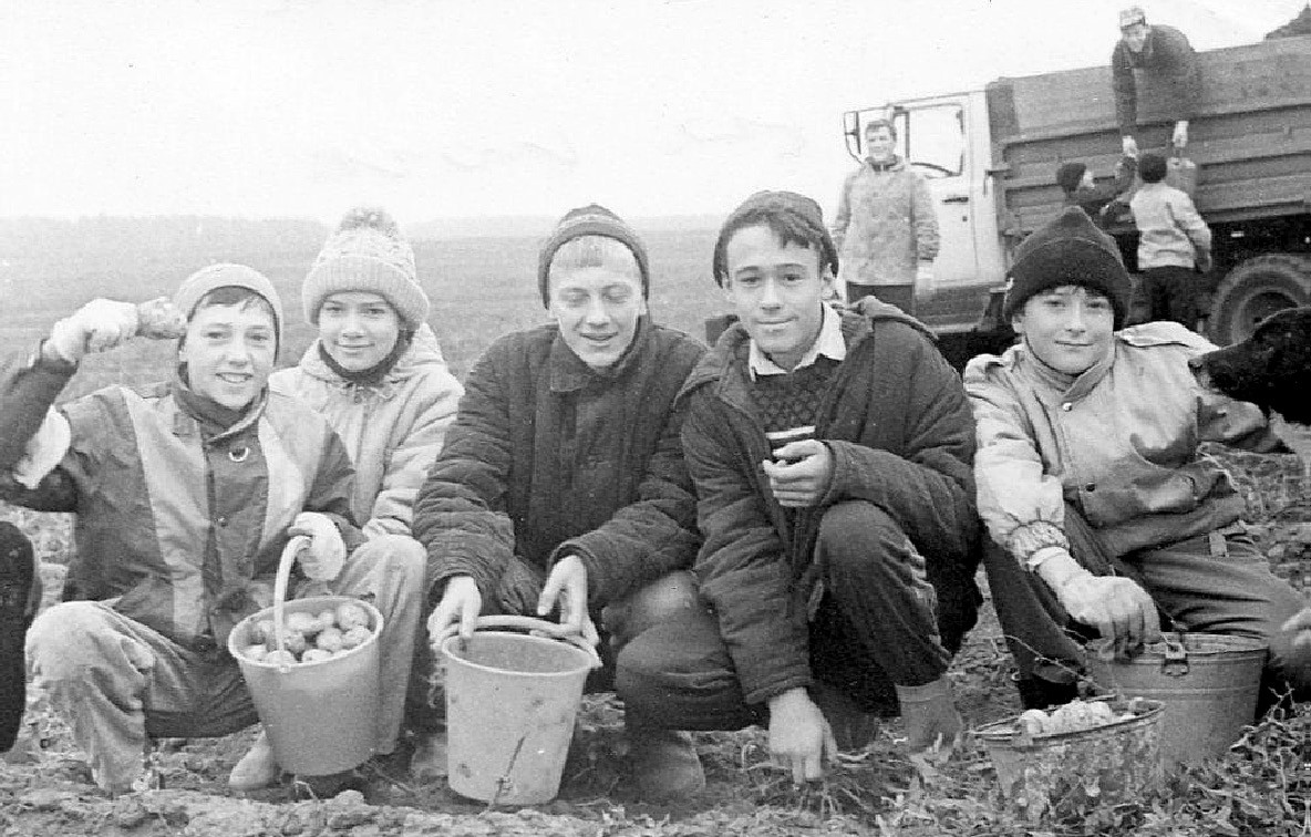 Мы по 5 человек вставали на пласт уже выкопанной картошки и собирали в вёдра. Девочки собирали, а мальчишки носили картошку и высыпали в телегу трактора, который двигался между пластов по мере сбора картофеля. Работа закипела. До обеда мы собрали 2 тракторных тележки. Приехавшая машина забрала нас с поля и повезла в столовую. С обеда работать стало труднее и тяжелее. С обеда мы собрали 3 телеги, и уставшие, не дожидаясь машины, пошли пешком до места ночлега.