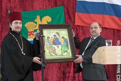 Через какое-то время со сцены взору свидетелей инаугурации предстала вполне солидная выставка подарков. В их числе была икона Пресвятой Троицы в добротном окладе. Эту икону подарил Благочинный Уржумской округи, настоятель Уржумского Свято-Троицкого собора священник Андрей Лебедев.